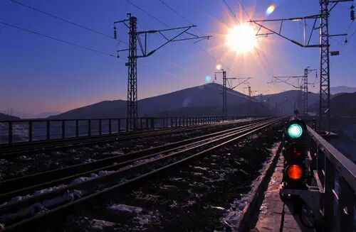 图为晨光下的张唐铁路电气化接触网工程